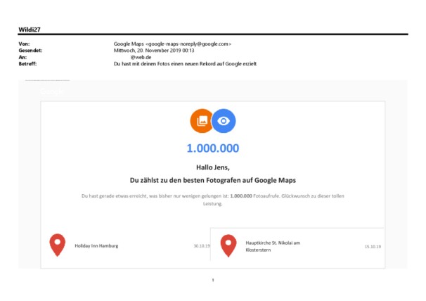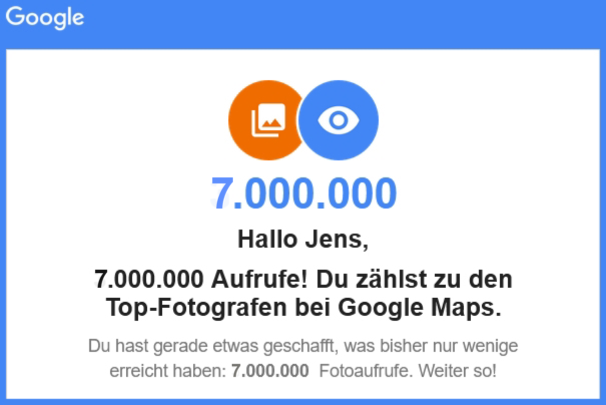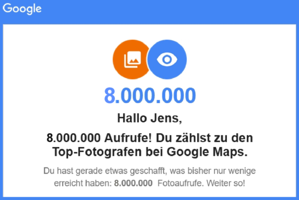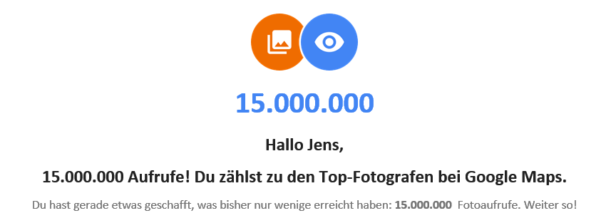 Bei Google Streetview sind u.a. 360°-Panoramen besonders erfolgreich, da sie sehr gern und sehr oft aufgerufen und angeschaut werden.Die nebenstehende Ehrung habe ich von Google erhalten.